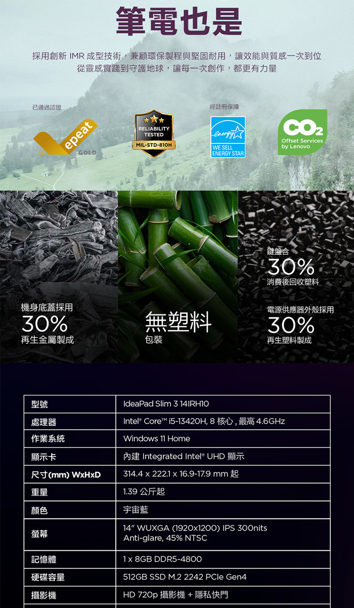 Lenovo IdeaPad Slim 3 83K100PQTW 15.3吋效能筆電 i5-13420H/8G/512G PCIe SSD/Win11
