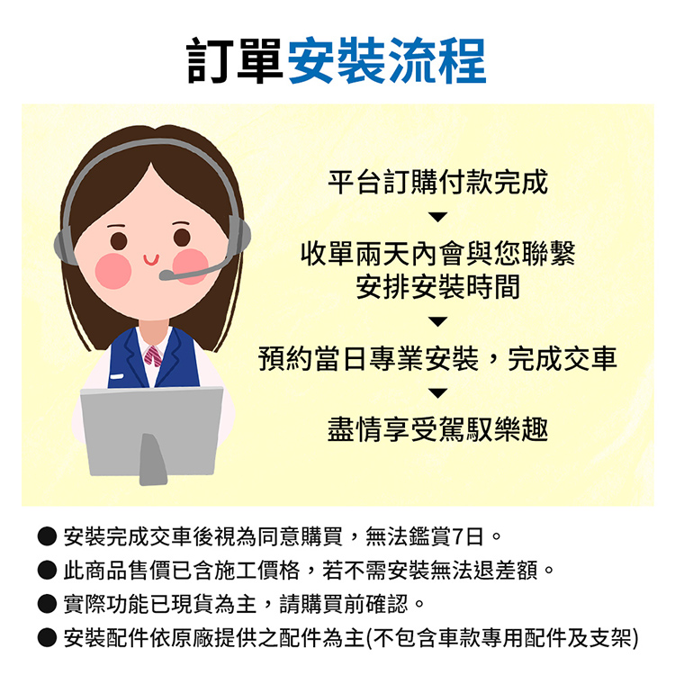 1.視汽車款,安裝費用若需另外加費,會請專人與您聯繫說明(例如:歐系車款..)