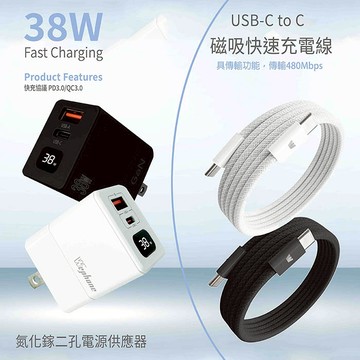 Wephone 38W氮化鎵 數字顯示雙孔充電器+雙頭Type-C 磁吸收納快充線(120公分)