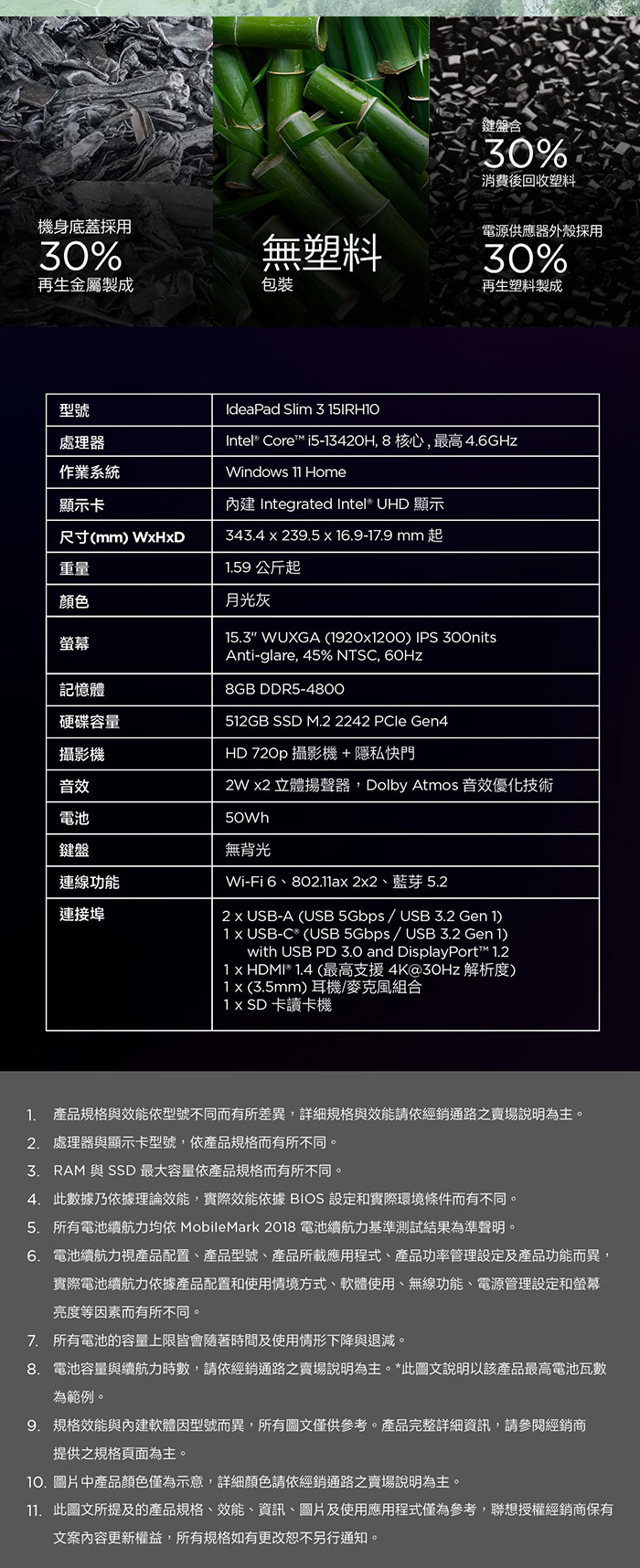 Lenovo 聯想 IdeaPad Slim 3 83K1001UTW 15.3吋效能筆電 i5-13420H/8G/512G PCIe SSD/Win11/二年保