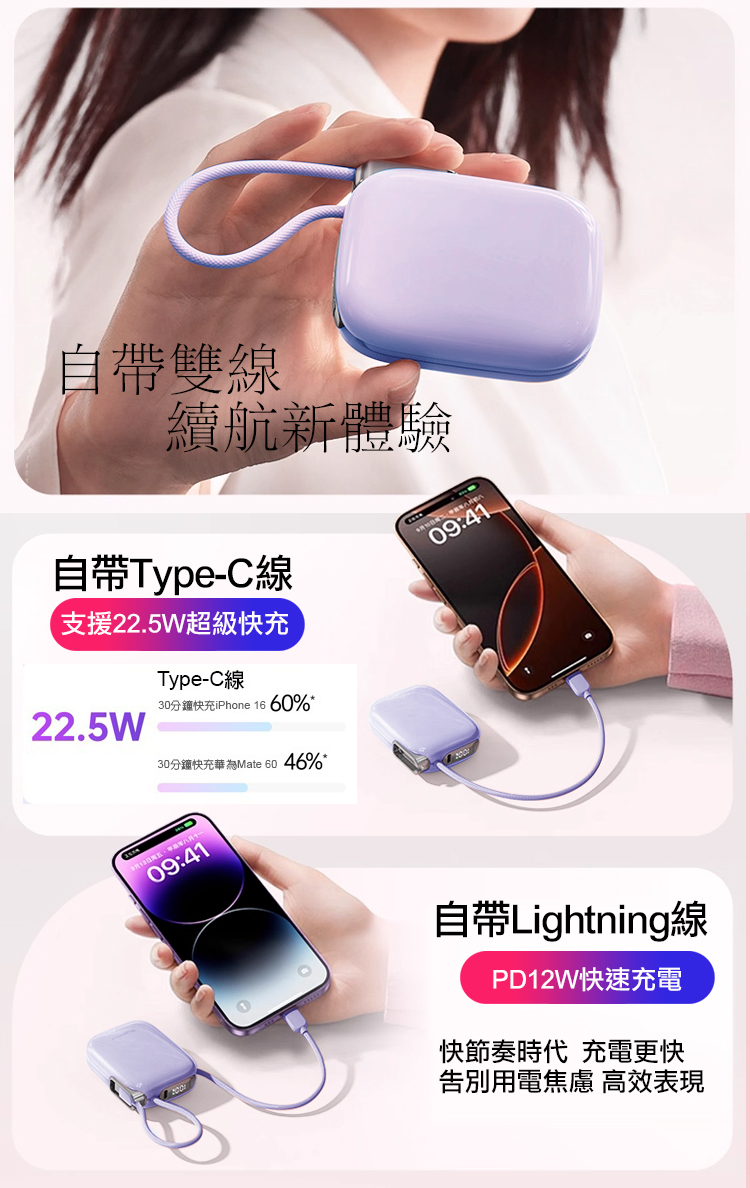 自帶雙快充線(TypeC+Lightning)充電便利