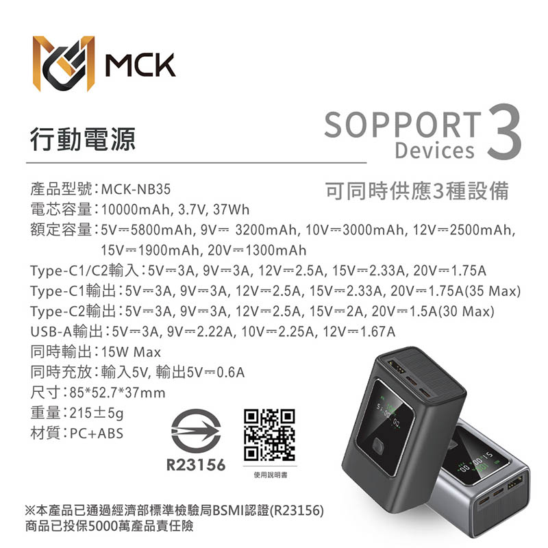 MCK 台灣製造 10000mAh 35W數顯快充行動電源(數顯電壓、電流、瓦數)
