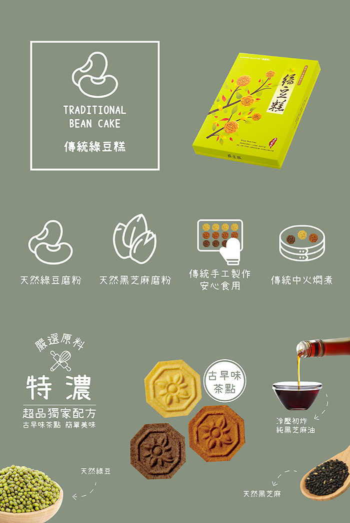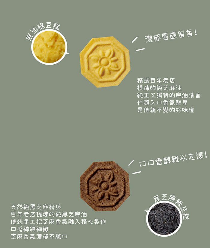 麻油綠豆糕:精選百年老店提煉的純芝麻油,純正又獨特的麻油清香,伴隨入口香氣醇厚,是傳統不變的好味道。