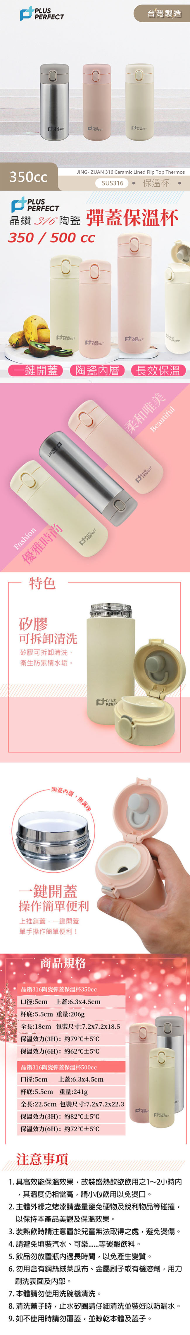 理想PERFECT 晶鑽316陶瓷彈蓋保溫杯350ml SJ-7102350 台灣製 霧粉色