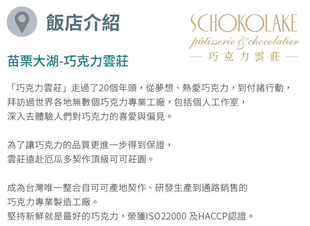 苗栗大湖【巧克力雲莊】雲莊蛋糕午茶遊園趣 (平日優惠)(MO26)