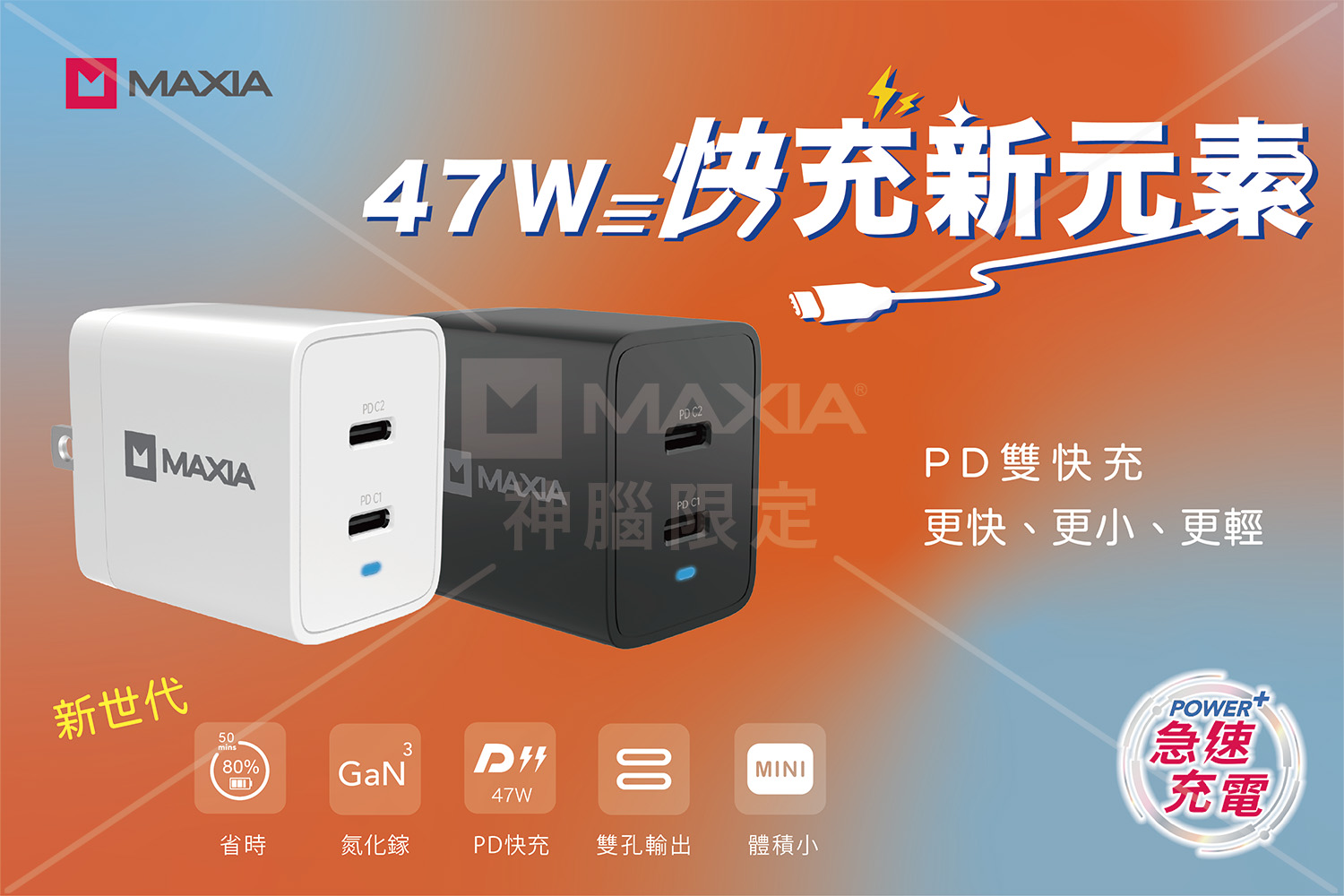 【MAXIA】氮化鎵GaN 47W急速快充組-白線(MPC-A47W+MQC-250)
