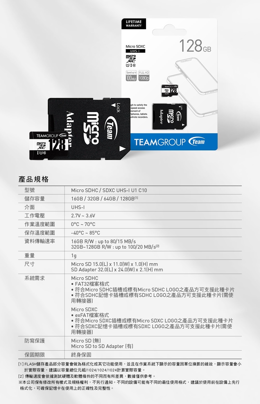 Team 十銓 128G 100MB/s U1 microSDXC UHS-I C10記憶卡