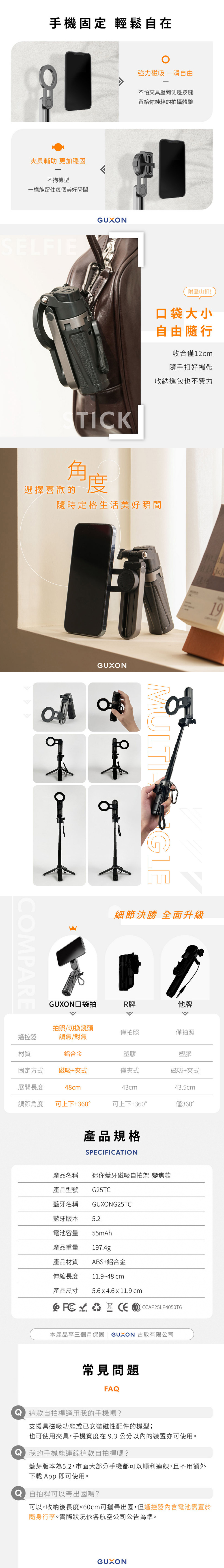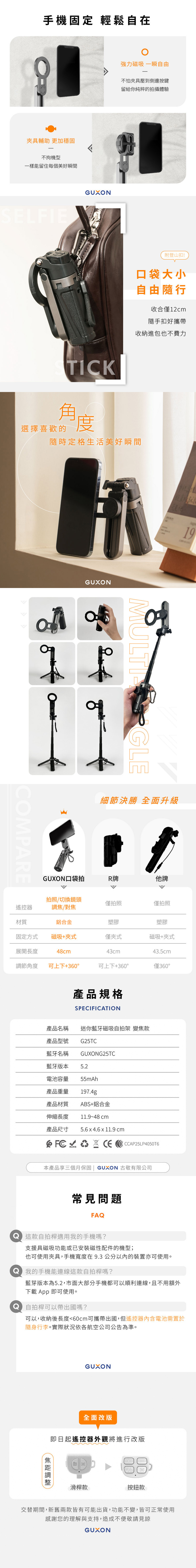 【GUXON古尚】口袋拍 迷你藍牙磁吸自拍架/自拍棒/腳架 G25TC 變焦款