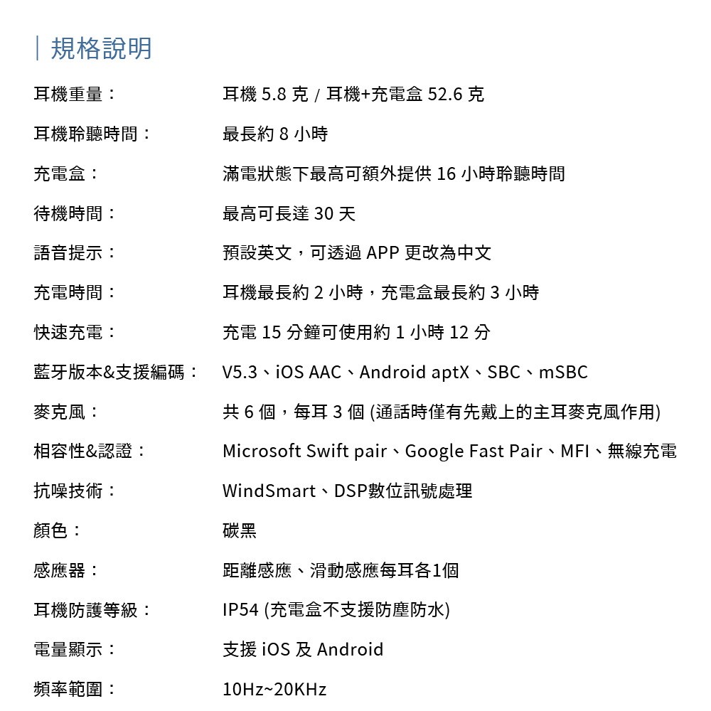 耳機防護等級:IP54(充電盒不支援防塵防水)