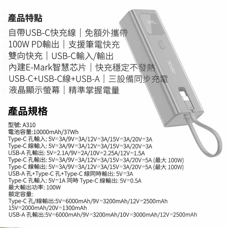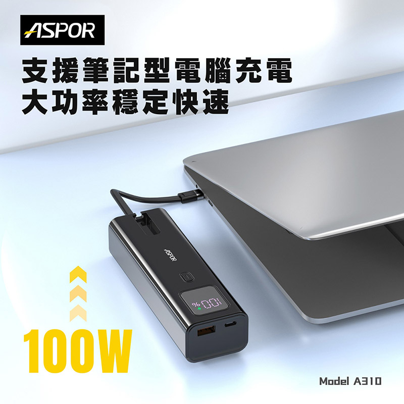 ASPOR 10000mAh 100W數顯快充行動電源(自帶USB-C快充線)