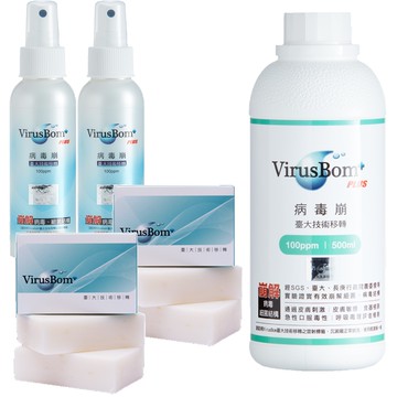 病毒崩 VirusBom - 齊心防疫必備組-100ppm噴劑100ml*2+100ppm補充瓶500ml*1+100ppm白麝香燕麥淨膚皂100g...
