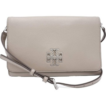 TORY BURCH - 銀色LOGO字牌防刮皮革翻蓋斜背包 (灰)