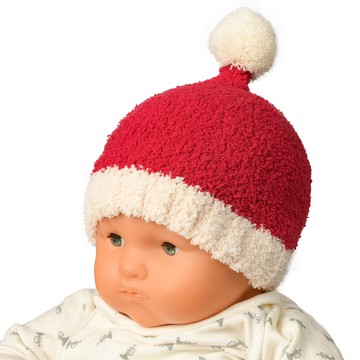 選用毛茸茸的柔軟紗線所製成,觸感非常舒適。頭部頂端尖尖的造型非常迷人。頂端還有球球,非常可愛。活潑可愛的雙色配色