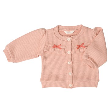 很方便且又百搭的開襟外套。緹花材質、易搭配的顏色。胸口處的蝴蝶結很吸睛。是一款可輕鬆調節溫度的便利單品。有名牌標可寫上小寶貝的名字