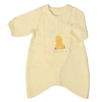 配合愛睡期寶寶的青蛙腿,設計成較寬鬆形狀。即使小寶寶舞動雙腳也不會覺得卡卡的。是一款可讓小寶寶穿得很放鬆的連身衣。為防止扣錯,胯下的扣子做成不同顏色。穿脫方便快速,讓父母不會感到壓力的連身衣