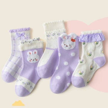 love, charlotte - 秋冬款淺紫色小兔子荷葉花邊中筒襪-5 雙一組
