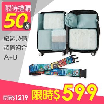 可防潑水可水洗。不易退色好清潔。七件套輕量出門。耐磨耐用、保護行李箱不爆開。行李束帶材質鮮豔飽和、獨家台灣意象設計
