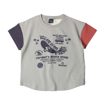 正面印有街頭元素圖案。搭配袖子和背部的拼接色塊,是這款T恤亮點。幼兒款的肩膀處可打開。設計上充滿小朋友"喜歡"的各種元素。能讓小朋友露出溫柔笑容的衣服”crescent”