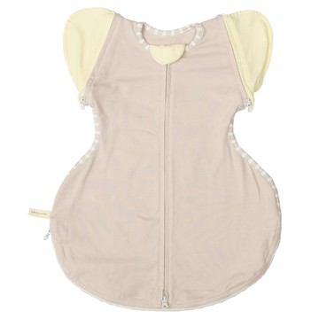 只需穿上,就可以彎曲手臂和腿部。蝶型包巾身長較短,可彎曲腿部穿的結構。雙臂可向外伸出。在開始會翻身的時候,也可取下袖子穿。拉開拉鏈可露出腿部,方便快速地換尿布