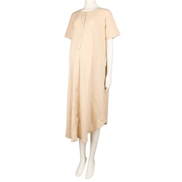 選用華夫格布料所製成的短袖洋裝。裙擺有釦子,扣上後可防止睡覺時衣服往上捲。打開前面的釦子就會變成可哺乳的款式。兩側有可放手機或手帕的口袋