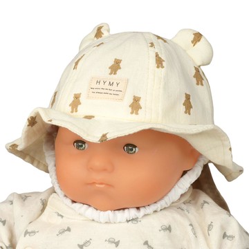 選用棉紗布料所製成的自然風格單品。立體的耳朵造型非常引人注目。小熊的滿版印花讓整體更加可愛。有附外出活動時非常需要的防曬遮陽布