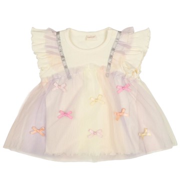 像落肩袖T恤上有細肩帶背心的假兩件式設計。細肩帶背心選用漸層色的薄紗材質。配上緞面蝴蝶結,少女感十足。有名牌標可寫上小寶貝的名字