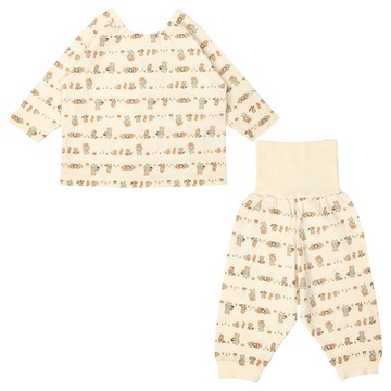 有凹凸質地和表面變化。膚觸良好舒適的純棉華夫格材質。上衣及褲子都不分前後,。可從穿錯邊的壓力中解脫。象牙白的底色搭配動物滿版印花