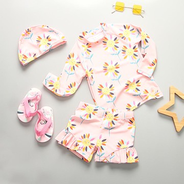 Xiazhilian - 女寶防曬長袖泳裝套裝(附帽子)-太陽花-粉色