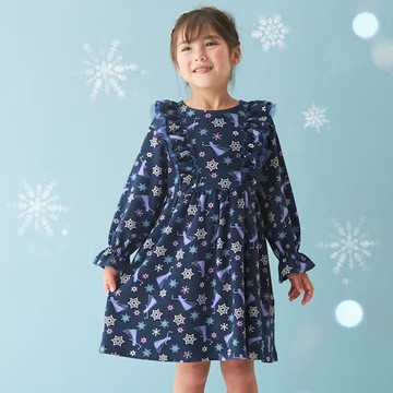日本千趣會 - 聯名款 印花摺邊純棉長袖洋裝-艾莎-深藍