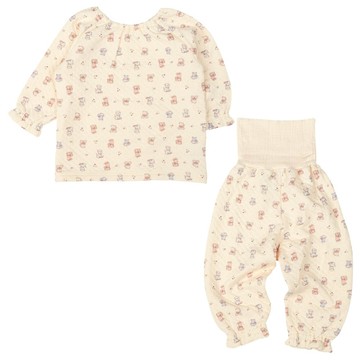 不分前後,讓換衣能更順暢的家居服。後領有鬆緊帶,好穿脫。有附肚圍的褲子,能防止腹部受寒。洗標上有名牌標可寫小寶貝的名字。在托兒所需要換穿等的時候,非常方便