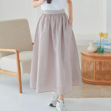 日本 Kobe Lettuce - 清爽透明格子鬆緊長裙(有口袋)-可選長度-摩卡