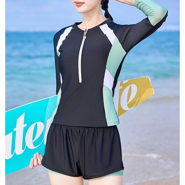超顯瘦長袖防曬泳衣套裝-黑拼綠