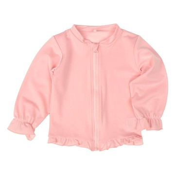 袖子與下擺部分抓皺,搭配綴荷葉邊。前開式拉鍊設計,穿脫輕鬆、簡單。長袖款式,適合用來防曬,UV遮蔽率90%以上。非常適合在海邊或游泳池穿的防曬泳衣