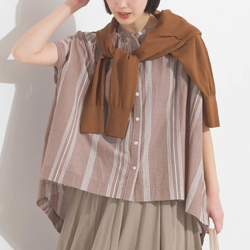 日本 OMNES - 100%印度棉 輕盈寬版襯衫式上衣-條紋-棕
