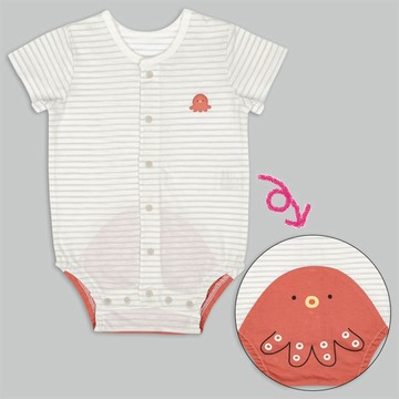 屁屁的的地方有可愛的海洋生物圖案。可讓學爬、搖擺學步時的小寶寶看起來更可愛。為防止釦子扣錯,胯下的釦子使用不同顏色。穿脫更簡單。打開前面的釦子後,還藏有溫馨的小驚喜喔