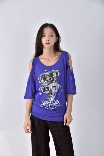 (L) huang shu chi骷髏點鑽露肩藍色短袖上衣