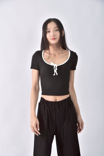 (XS(含)以下) 【語芯私服】修身短版u領綁帶黑色短袖上衣