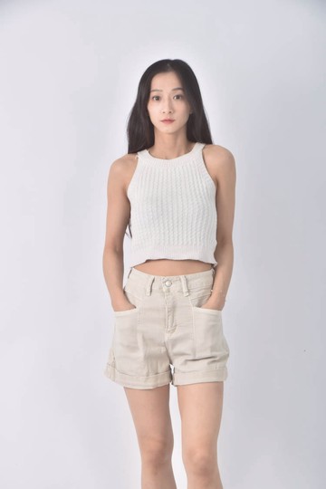 純棉牛仔高腰金屬釦割破抽鬚短褲