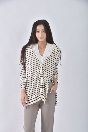 (L) net條紋白色長袖上衣