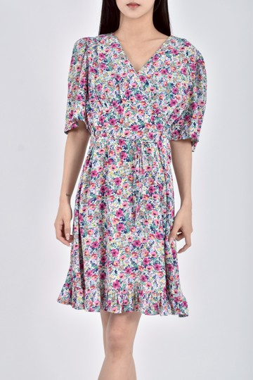 前后方領碎花印花裹胸系帶高腰開叉中長短袖連衣裙woman's dress