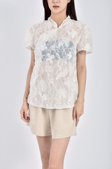 (S) cherjoy atelier質感蕾絲透膚中式白色短袖上衣