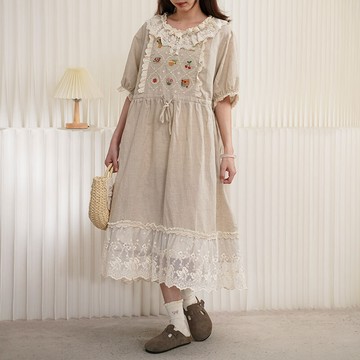 森系 蕾絲拼接刺綉係帶洋裝121307C