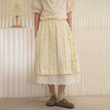 側係帶碎花蕾絲拼接中長裙121362C