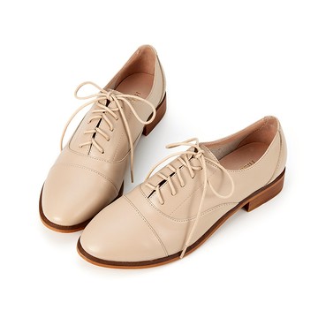 全真皮簡約拼接橢圓頭素面牛津鞋 奶茶色