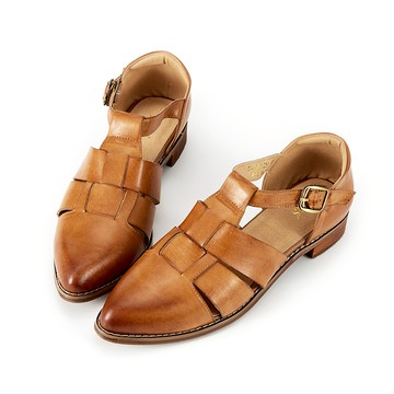 蠟感擦色全真皮羅馬T字編織尖頭低跟鞋 駝色