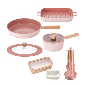 粉紅FIKA系列鑄造三鍋組-單柄湯鍋+平底鍋+烤盤(不挑爐具,瓦斯爐電磁爐可用)贈矽膠廚具組+通用鍋蓋+FIKA ONE保鮮盒組