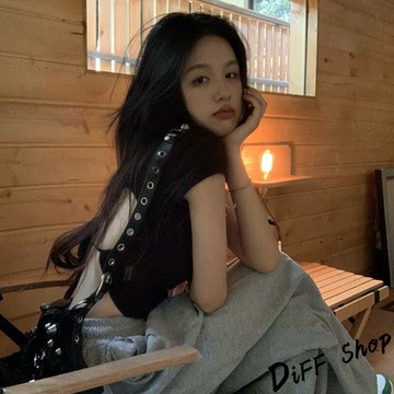 輕語STUDIO~美式復古辣妹字母印花斜肩短袖女夏季小眾寬松露肩T恤