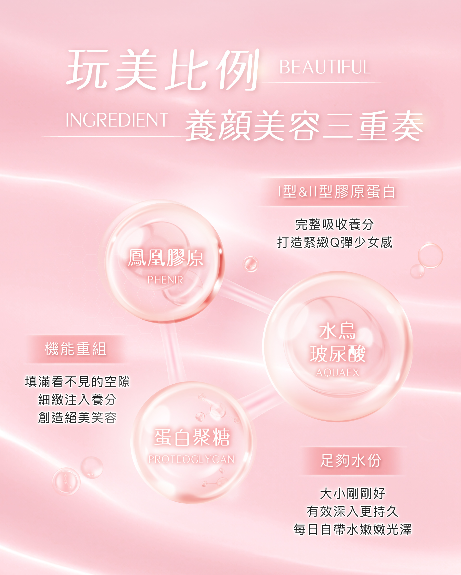 01.鳳凰膠原:含有I型&II型膠原蛋白,完整吸收養分,打造緊緻Q彈少女感