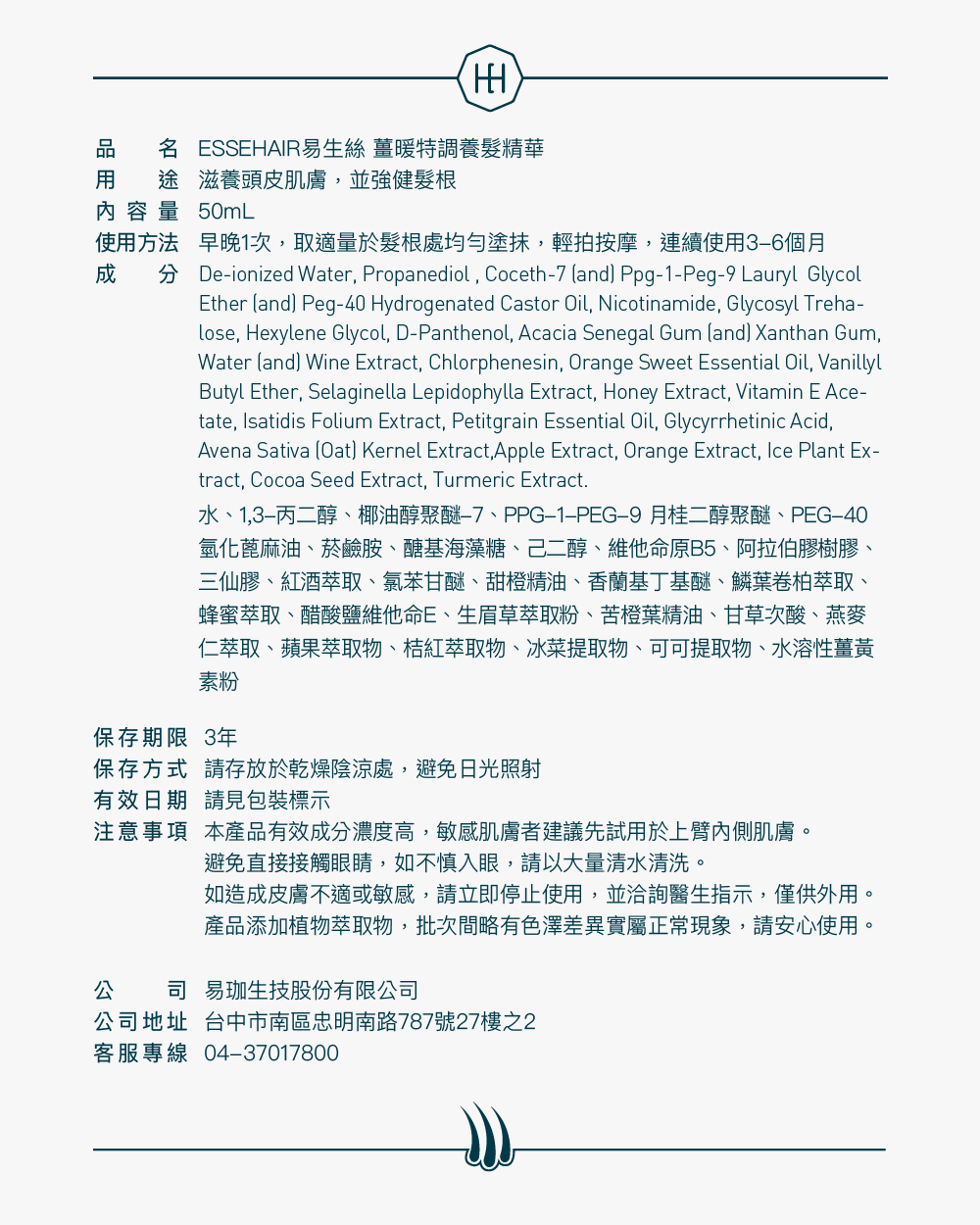 【ESSEHAIR 易生絲】薑暖特調養髮精華 50ml (孕期產後可用/有機精油/抗老保濕)
