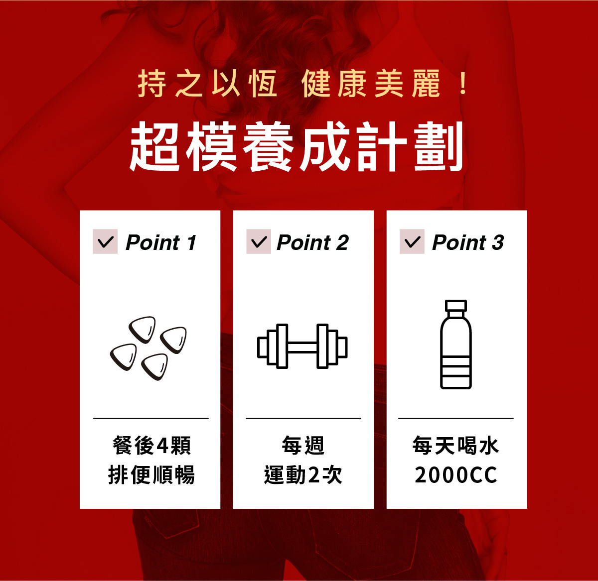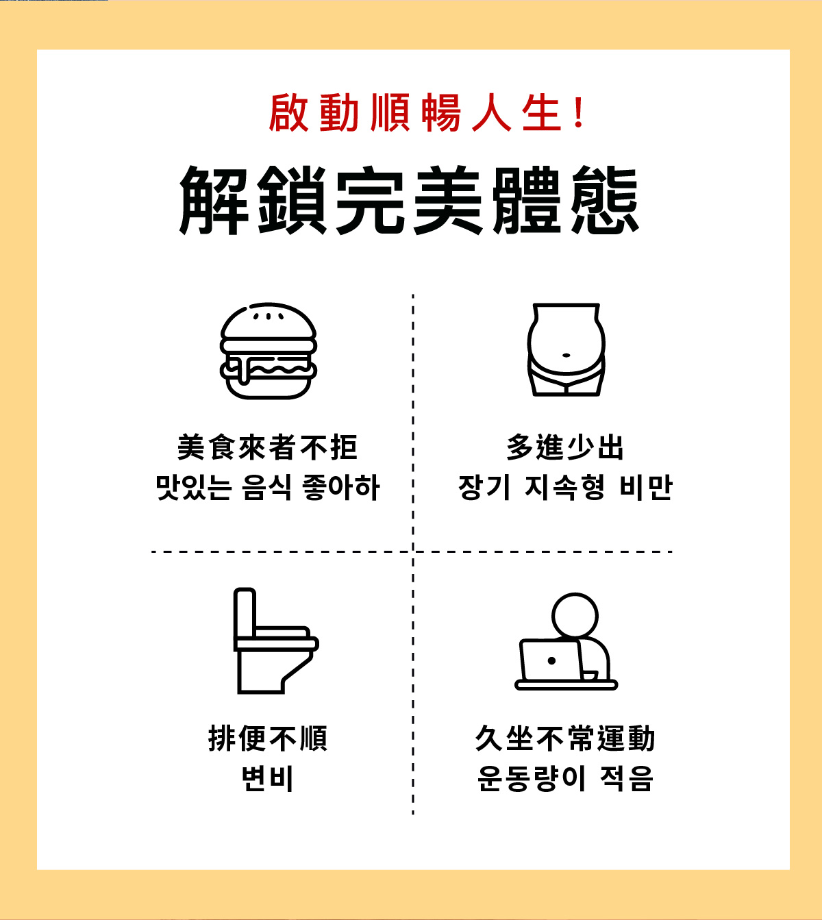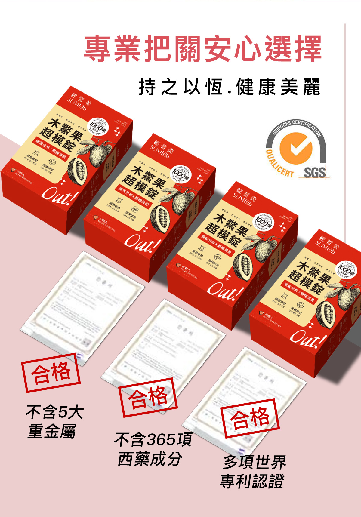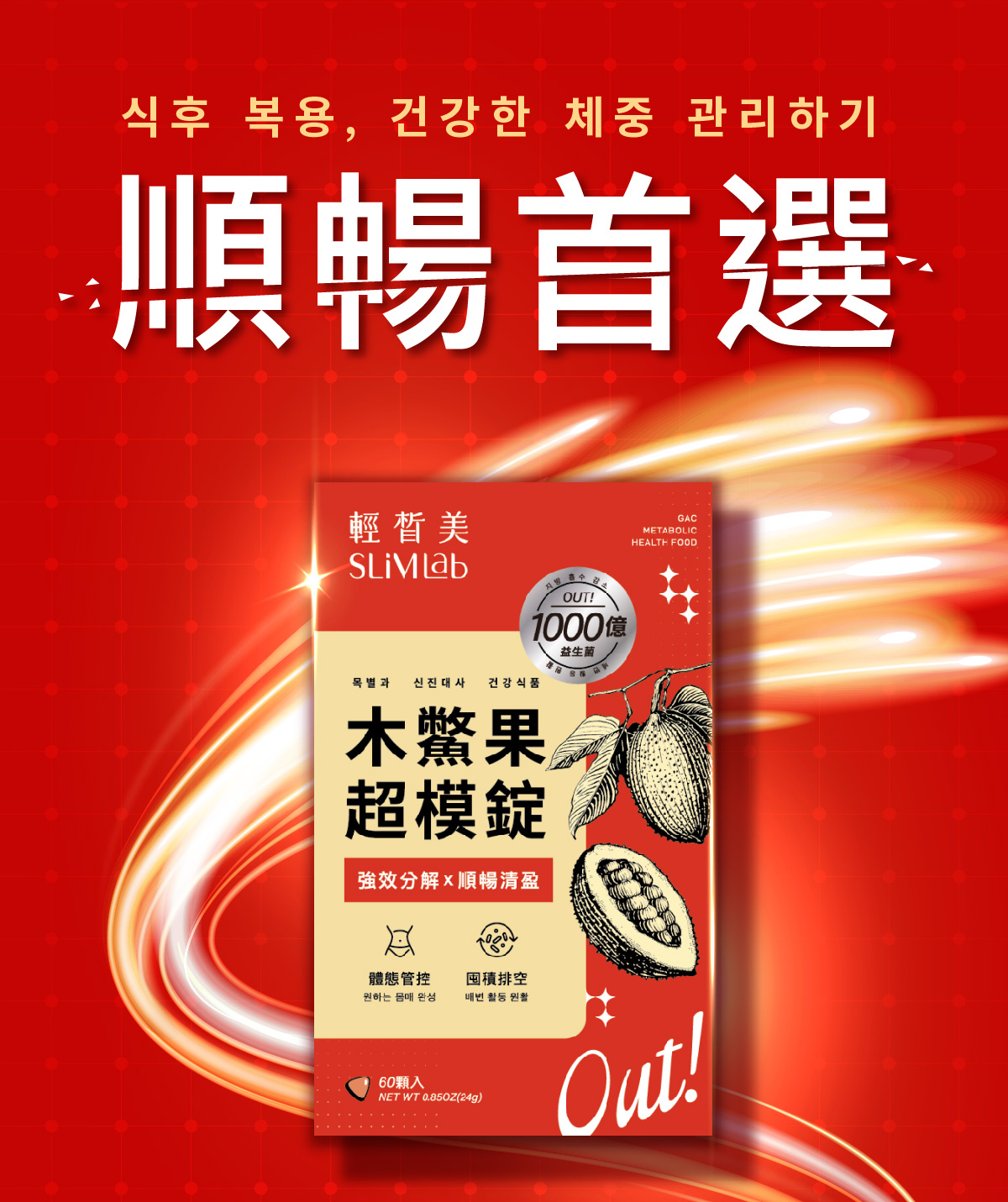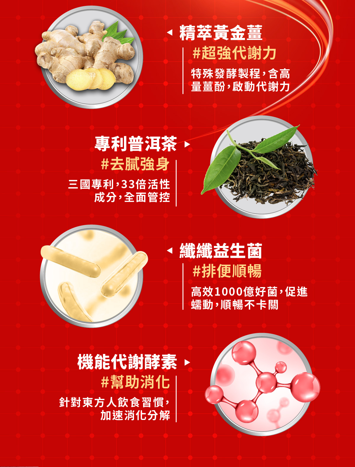 成分 : 綠茶萃取物、木鱉果萃取物、羊角豆萃取物、專利管花肉蓯蓉萃取物、專利普洱茶萃取物、黃金薑粉末、紫茶萃取物、專利草莓萃取(含草莓濃縮萃取物、糊精)、專利阿拉伯糖、綜合分解酵素(Protease、Amylase、Lactase、Cellulase、Lipase)、L-肉酸(L-肉酸、氫化棕櫚油)、綜合益生菌(L.reuteri、Streptococcus thermpohilus、Lactobacillus acidophilus、L.casei、L.paracasei、L.plantarum、L.rhamnosus、Bifidobacterium breve、B.longum subsp.infantis、B.animalis subsp. lactis)
